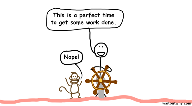 Dit verschijnsel verdwijnt meestal niet na onze kindertijd. Er zijn maar weinig mensen die geen uitstelgedrag vertonen. Op iedere schouder zit een blij aapje die het stuur wil overnemen. Dit aapje wil alleen voor de korte termijn plezier en denkt niet na over de gevolgen. Dieren hebben hier geen last van. Een hond die constant blij is en niet nadenkt over morgen levert doorgaans geen problemen op. Echter voor ons als mensen is dat een andere kwestie. Van ons wordt verwacht dat we vooruit denken en onze deadlines halen.